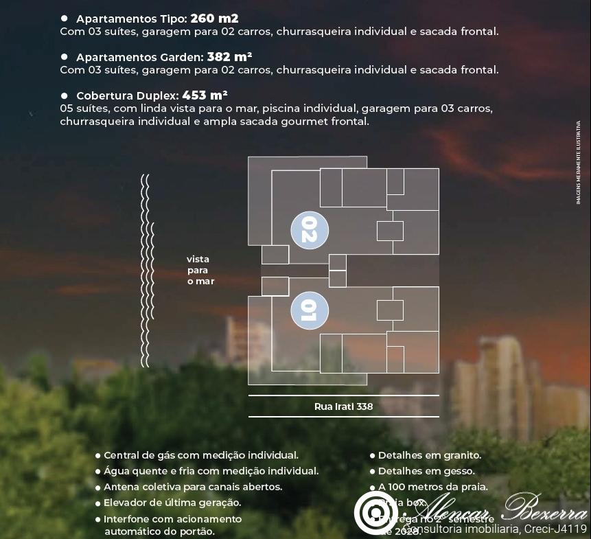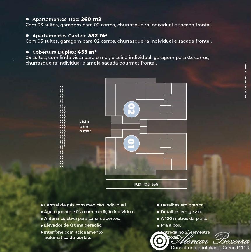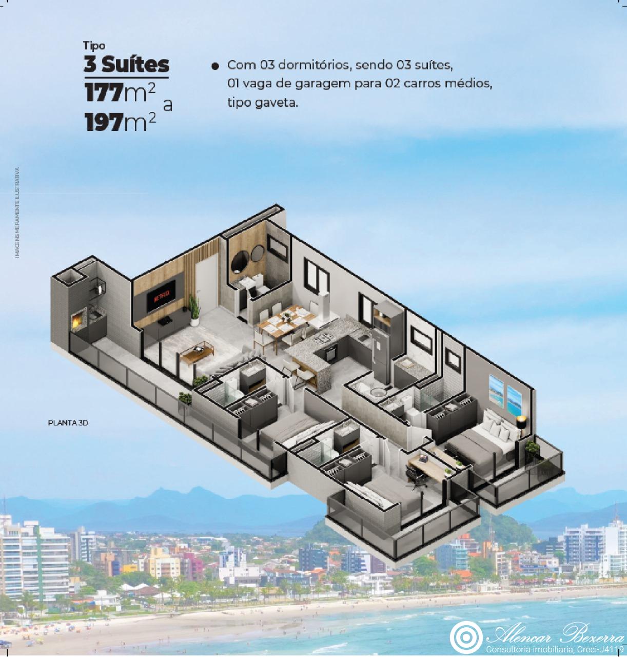 Todas as unidades terão ampla sacada frontal com churrasqueira individual. Empreendimento localizado a 100 metros da praia o que proporciona uma linda vista para o mar, além de estar perto de infraestrutura de comercio, bancos, restaurantes e lojas. Venha realizar seus sonhos de moradia no litoral do Paraná.